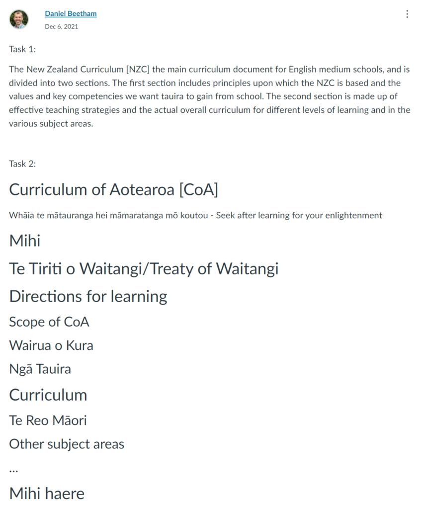 We also got the opportunity to rethink the New Zealand Curriculum. Above is a post that outlines the headings for my New Zealand Curriculum ‘refresh’. It includes similar layout to the current New Zealand Curriculum, but critically has Wairua o Kura and Ngā Tauria sections to focus on the relational aspects of teaching prior to thinking about subject areas. It also puts a focus on the spirit of a kura and how this can impact on tauira. This might include all the ways in which behaviour is managed, whether detention is used or restorative justice practices in the school, as well as how staff and students are expected to interact. It also places re reo Māori in it’s own section first. I image under the Curriculum of Aoteroa, that te reo Māori would a normal part of the classroom along side other subject areas.