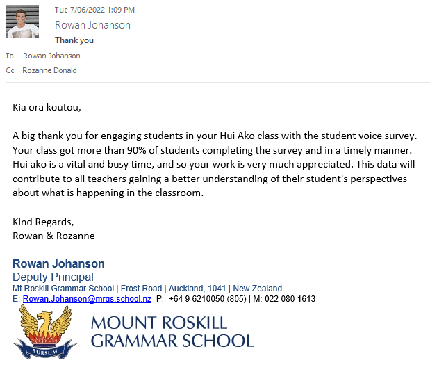 Part of working in a school is working hard to help achieve the outcomes that the school desires. This may seem like a lot of work at the time, but often the results are worth it. In the case of the student engagement survey, as well as helping my colleagues with getting feedback from students in their class, it also gave me feedback from my tauira.