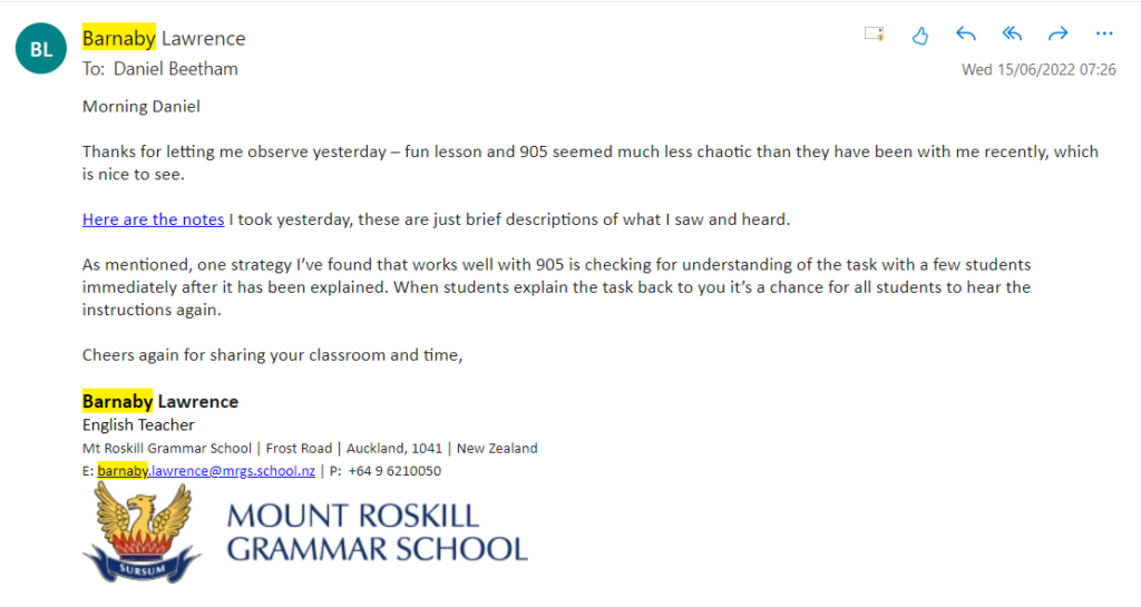 I believe that I can learn something from anyone who is observing me in the classroom. I’ve enjoyed working with different staff members who have observed me, and I think it’s ideal to have the attitude that I can welcome anyone into the classroom at any point. Different people also come with different perspectives. For example, I had the head of the junior program observe me in my Y10 class, who helped students understand the upcoming summative assessment. I also had my mentor, Kailash, and Kay Hawk in my classroom, which was a double observation, with Kailash observing and mentoring me, and Kay observing and mentoring Kailash. I’ve also taken a video of myself for my colleague to give me feedback on my teaching.